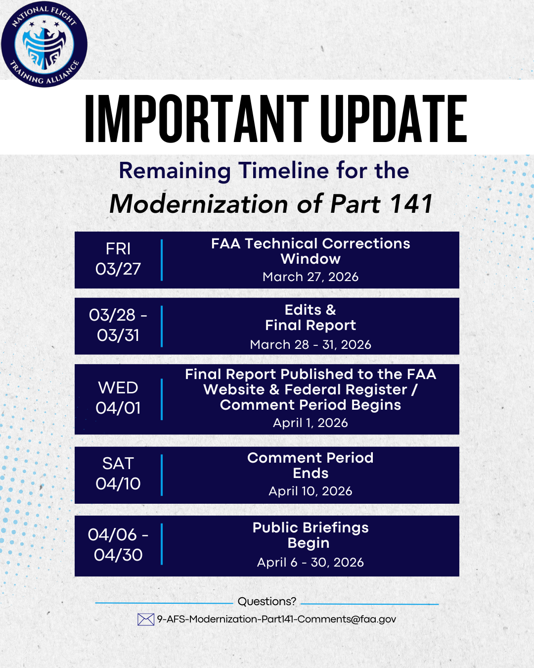 This survey is being conducted by the National Flight Training Association (NFTA) as part of the 14 CFR Part 141 Modernization effort, in partnership with the Federal Aviation Administration (FAA) to gather industry input from applicants, flight instructors, and flight training organizations.